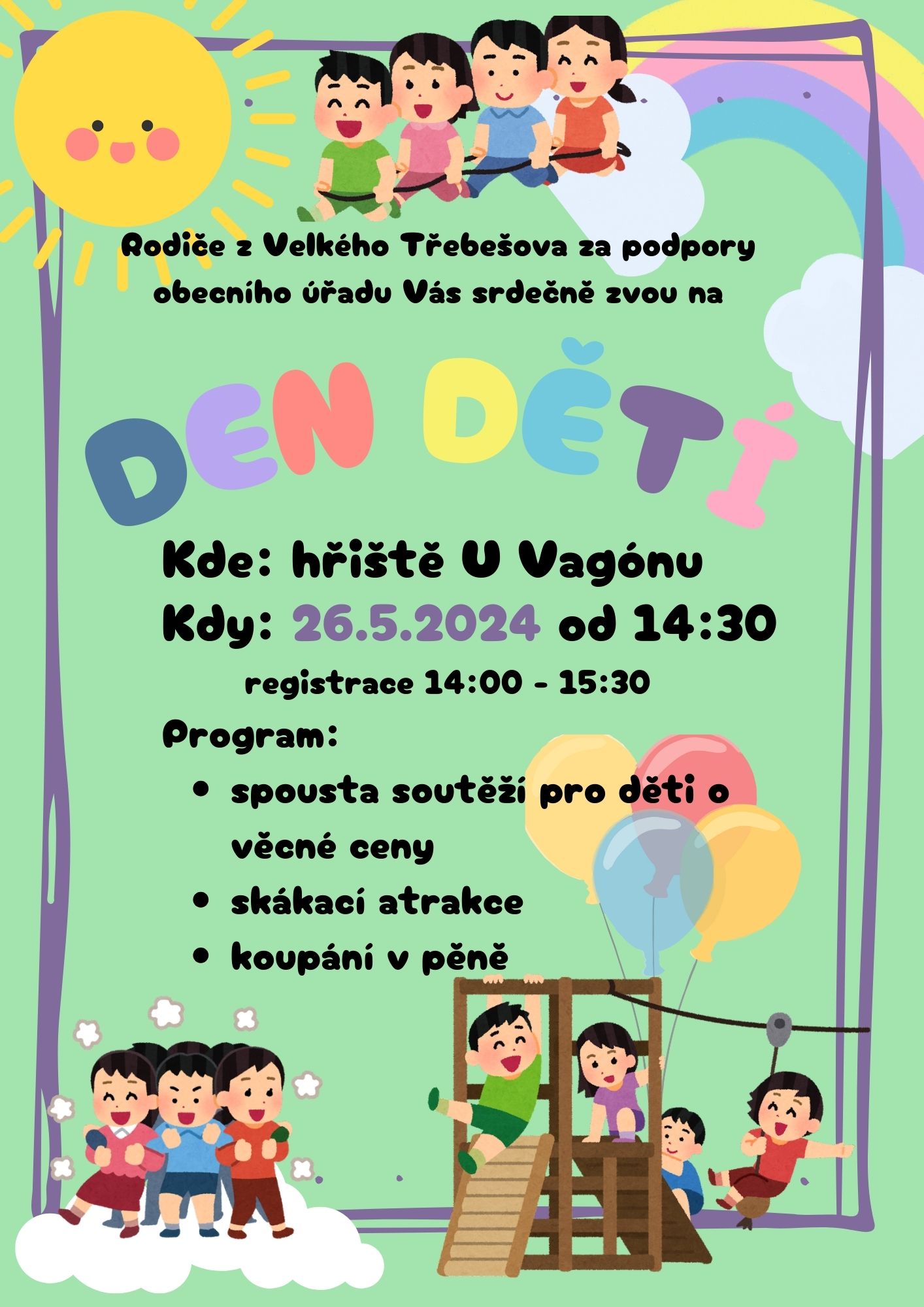 Dne 26. 5. 2024 se od 14:30 hod bude konat na hřišti "U Vagonu" dětský den.